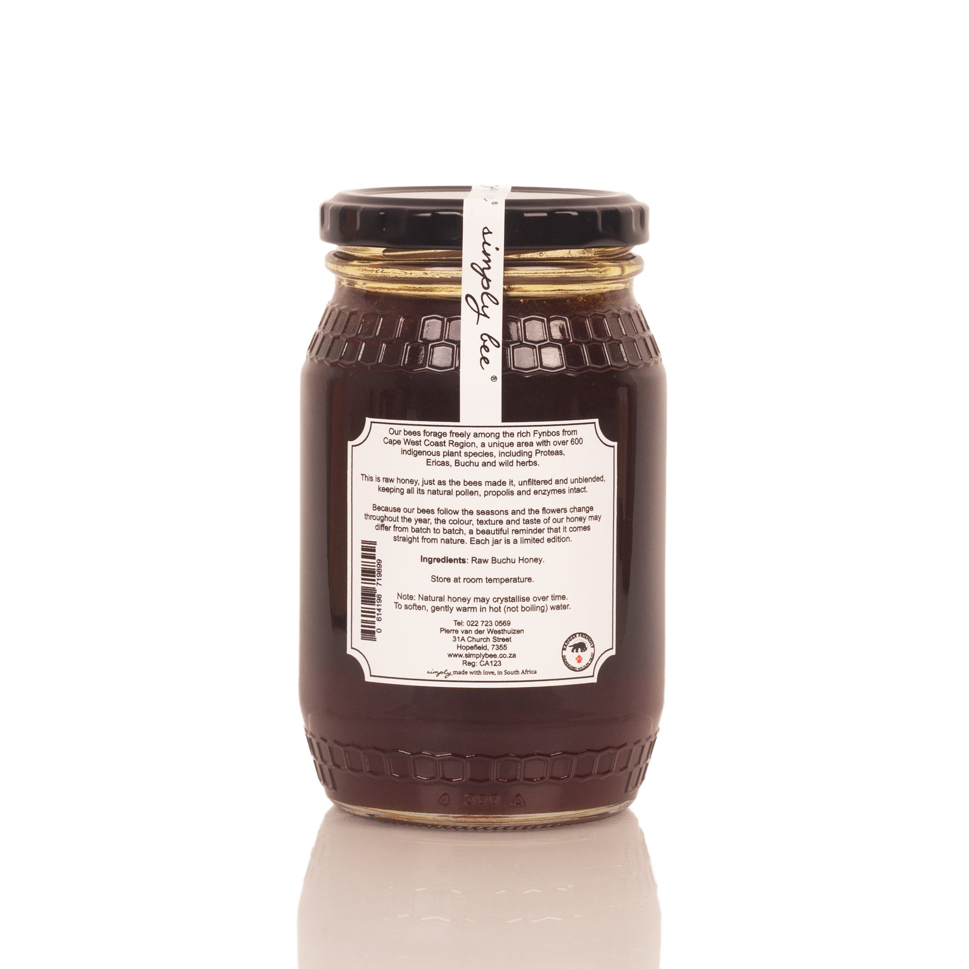 Raw Buchu honey is a natural and versatile remedy offering a range of health benefits. With its anti-inflammatory, antibacterial, and antioxidant properties, it promotes overall wellness and strengthens the immune system. Our bees collect nectar from the local buchu Fynbos, a remote area free from commercial farming, reducing pesticide exposure. We never feed or medicate our bees. Our raw buchu honey is harvested straight from the hive using traditional methods, without filtering, irradiating, or processing. The honey’s colour, flavour, and consistency naturally vary depending on the blossoms visited by the bees. All Simply Bee honey is badger-friendly.